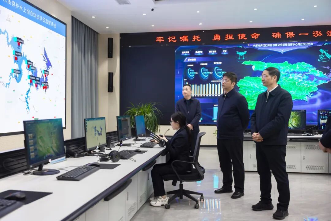 作为南水北调中线工程的核心水源地,丹江口水库肩负着“一库清水永续北送”的重任。调研组来到丹江口市水质安全保障指挥中心,详细了解城镇生活污水处理设施建设布局、老旧管网改造、水质实时监测系统运行等情况,对丹江口市立足南水北调中线工程核心水源区功能定位,将水质保障与城市高质量发展深度融合的工作举措给予肯定。调研组强调,要坚决扛起“江湖安澜、碧水东流、净水北送”政治责任,坚持系统治理,加快“两重”“两新”项目建设,推进生活污水处理设施改造升级,提升城镇生活污水收集处理质效。要强化科技赋能,实现从污水收集、处理到排放的全过程精准管控,确保水质持续稳定达标。